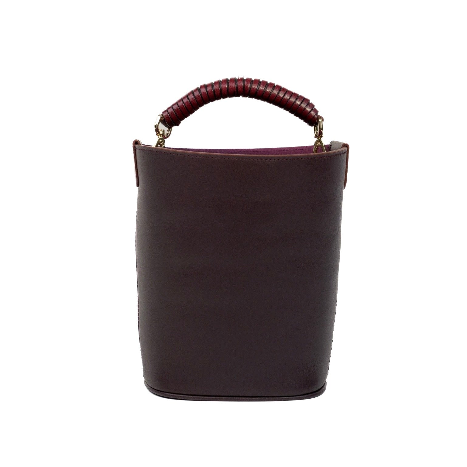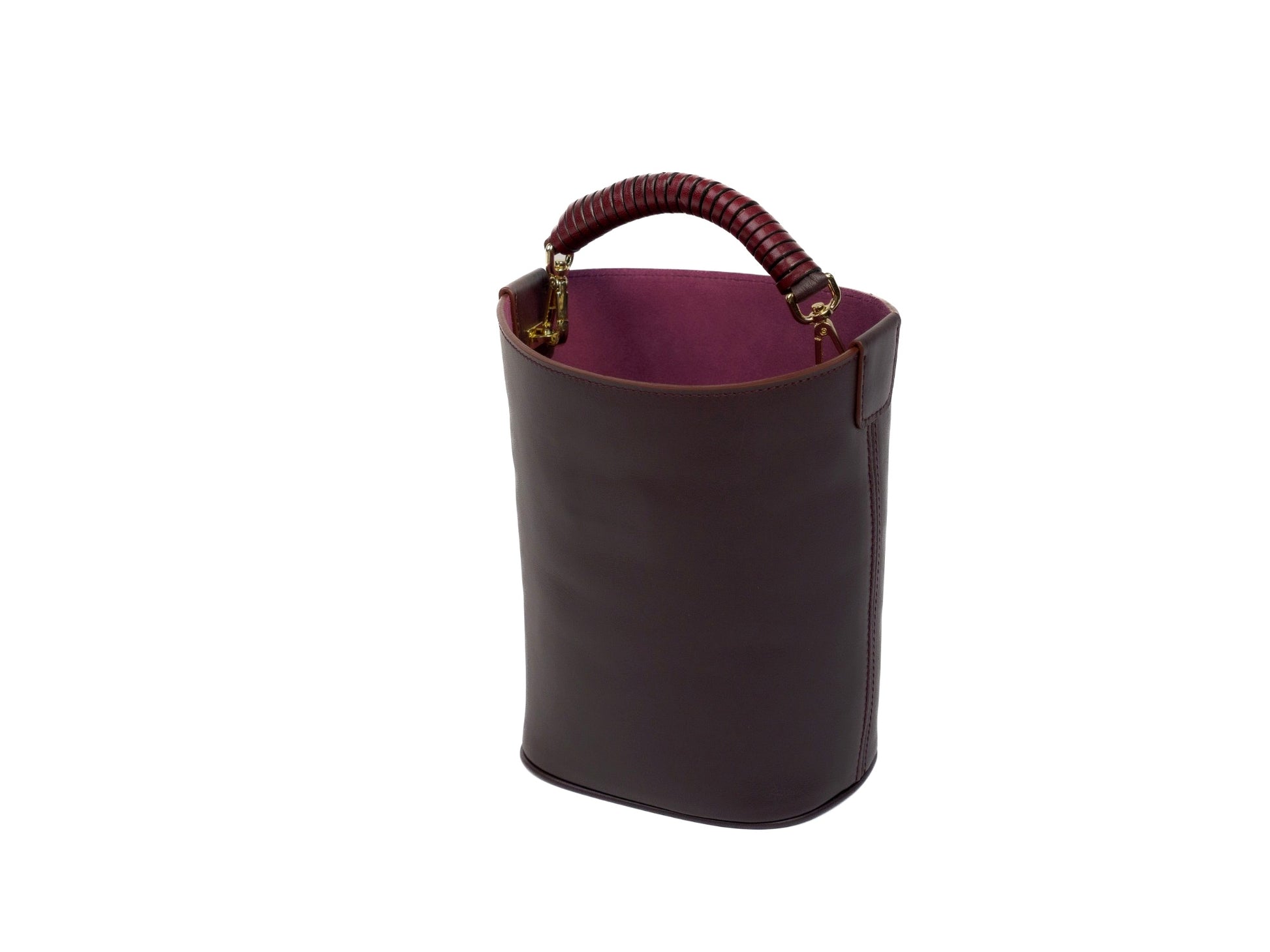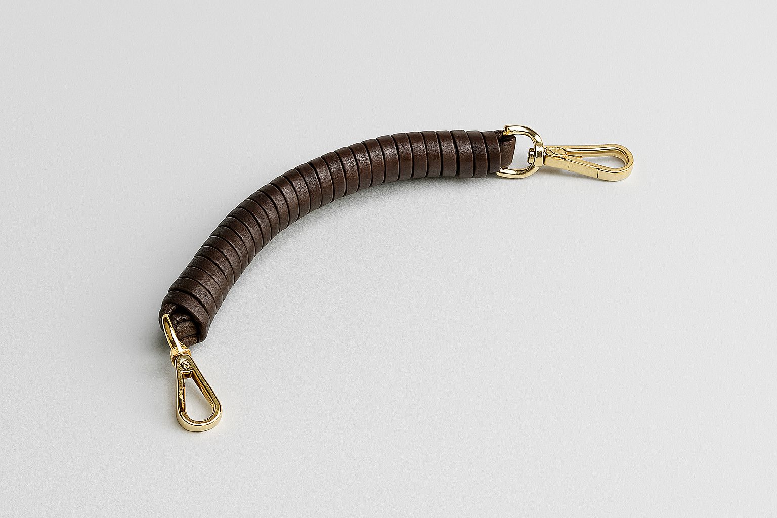 Nuestra asa de mano en piel enroscada alrededor de un eje para generar solidez y dar ese toque llamativo con mosquetones dorados para quitar y poner facilmente.
